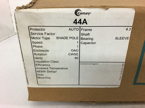 Century 44A Shade Pole Motor 1/15 HP 1550 RPM 4.3 Frame 115V OAO Enclosure Return Policy Returns accepted within 30 days. Items sold as is cannot be returned, unless description is in error. Buyer pays return freight. Shipping Policy We ship almost all items with 1 business day of cleared payment. We ship USPS and UPS. We can ship on your account. If you will be shipping freight, please be sure to provide all delivery contact information including a phone number. We will need to know if you have a fork lift or dock.