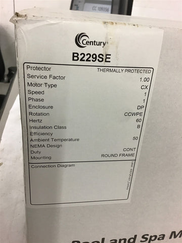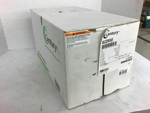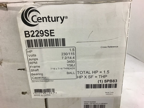 Century B229SE 1.5 HP Motor 230/115 Volts 7.2/14.4 Amps 3450 Rpm 56J Frame Return Policy Returns accepted within 30 days. Items sold as is cannot be returned, unless description is in error. Buyer pays return freight. Shipping Policy We ship almost all items with 1 business day of cleared payment. We ship USPS and UPS. We can ship on your account. If you will be shipping freight, please be sure to provide all delivery contact information including a phone number. We will need to know if you have a fork lift or dock.