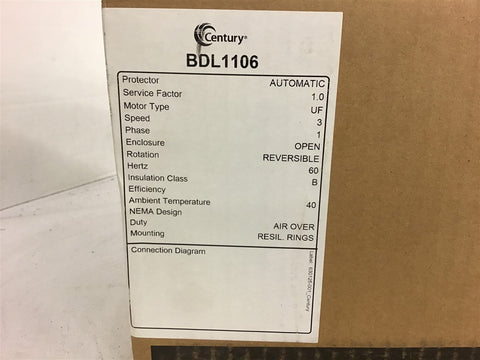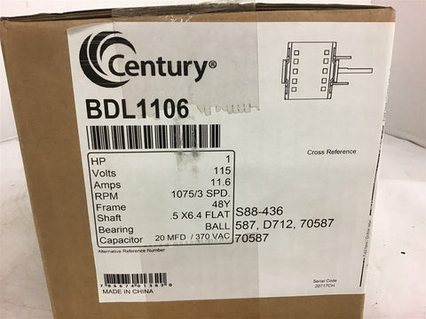 Century BDL1106 1 HP AC Motor 115 Volts 1075 Rpm 3 Speed 48y Frame Return Policy Returns accepted within 30 days. Items sold as is cannot be returned, unless description is in error. Buyer pays return freight. Shipping Policy We ship almost all items with 1 business day of cleared payment. We ship USPS and UPS. We can ship on your account. If you will be shipping freight, please be sure to provide all delivery contact information including a phone number. We will need to know if you have a fork lift or dock.