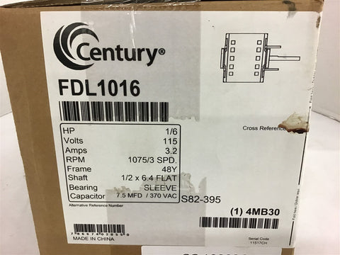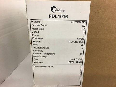 Century FDL1016 1/6 HP 115 Volts 1075 Rpm 3 SPeed 48Y 3.2 Amps Return Policy Returns accepted within 30 days. Items sold as is cannot be returned, unless description is in error. Buyer pays return freight. Shipping Policy We ship almost all items with 1 business day of cleared payment. We ship USPS and UPS. We can ship on your account. If you will be shipping freight, please be sure to provide all delivery contact information including a phone number. We will need to know if you have a fork lift or dock.