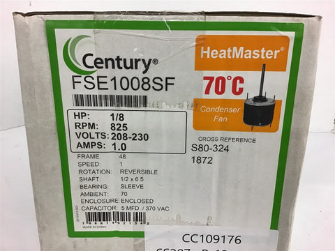 Century FSE1008SF 1/8 HP AC Motor 208-230 Volts 825 Rpm 48 Frame Return Policy Returns accepted within 30 days. Items sold as is cannot be returned, unless description is in error. Buyer pays return freight. Shipping Policy We ship almost all items with 1 business day of cleared payment. We ship USPS and UPS. We can ship on your account. If you will be shipping freight, please be sure to provide all delivery contact information including a phone number. We will need to know if you have a fork lift or dock.