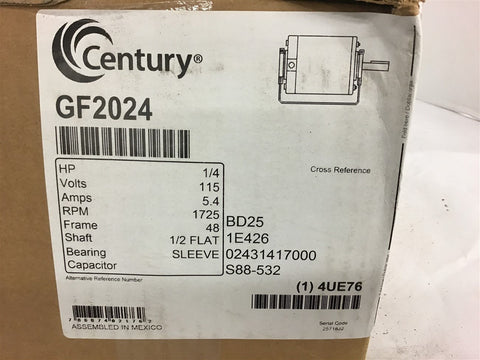Century GF2024 1/4 HP HVAC Motor 115 Volts single Phase 1725 Rpm 48 Frame 5.4 A Return Policy Returns accepted within 30 days. Items sold as is cannot be returned, unless description is in error. Buyer pays return freight. Shipping Policy We ship almost all items with 1 business day of cleared payment. We ship USPS and UPS. We can ship on your account. If you will be shipping freight, please be sure to provide all delivery contact information including a phone number. We will need to know if you have a fork lift or dock.