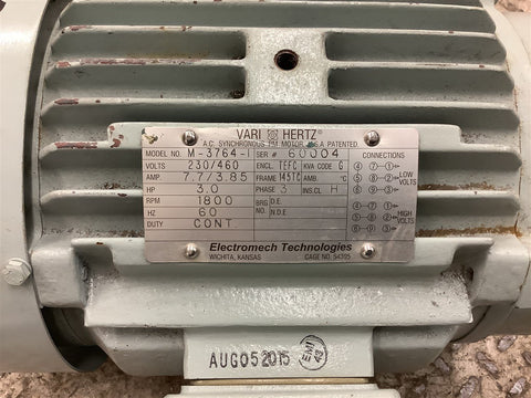 Electromech M-3764-I 3 Hp AC Motor 230/460 Volts 1800 Rpm 4P 145TC Frame Return Policy Returns accepted within 30 days. Items sold as is cannot be returned, unless description is in error. Buyer pays return freight. Shipping Policy We ship almost all items with 1 business day of cleared payment. We ship USPS and UPS. We can ship on your account. If you will be shipping freight, please be sure to provide all delivery contact information including a phone number. We will need to know if you have a fork lift or dock.