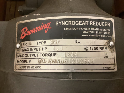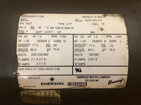 Emerson E186 1 HP AC Motor 208-230/460 V 1800 Rpm 4P 143T w/ 6WP Reducer 31:1 Return Policy Returns accepted within 30 days. Items sold as is cannot be returned, unless description is in error. Buyer pays return freight. Shipping Policy We ship almost all items with 1 business day of cleared payment. We ship USPS and UPS. We can ship on your account. If you will be shipping freight, please be sure to provide all delivery contact information including a phone number. We will need to know if you have a fork lift or dock.