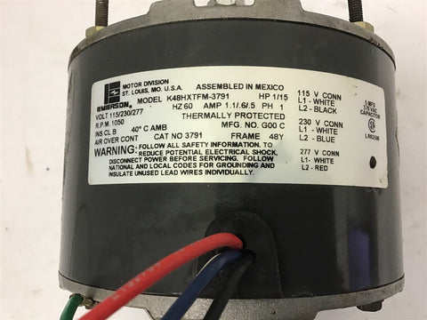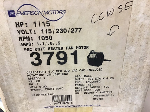 Emerson K48HXTFM-3791 1/15 HP AC Motor 1050 Rpm 115/230/277 Volts 48Y Frame Return Policy Returns accepted within 30 days. Items sold as is cannot be returned, unless description is in error. Buyer pays return freight. Shipping Policy We ship almost all items with 1 business day of cleared payment. We ship USPS and UPS. We can ship on your account. If you will be shipping freight, please be sure to provide all delivery contact information including a phone number. We will need to know if you have a fork lift or dock.