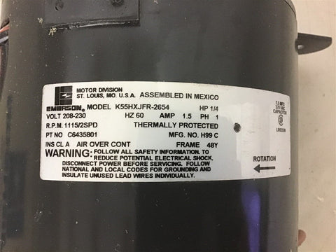 Emerson K55HXJFR-2654 1/4 HP AC Motor 208-230 V 1115 Rpm 2 Speed Return Policy Returns accepted within 30 days. Items sold as is cannot be returned, unless description is in error. Buyer pays return freight. Shipping Policy We ship almost all items with 1 business day of cleared payment. We ship USPS and UPS. We can ship on your account. If you will be shipping freight, please be sure to provide all delivery contact information including a phone number. We will need to know if you have a fork lift or dock.