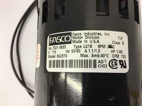 Fasco 7021-5655 1/45 HP Blower Motor 115 volts 3400 Rpm 150 CFM Return Policy Returns accepted within 30 days. Items sold as is cannot be returned, unless description is in error. Buyer pays return freight. Shipping Policy We ship almost all items with 1 business day of cleared payment. We ship USPS and UPS. We can ship on your account. If you will be shipping freight, please be sure to provide all delivery contact information including a phone number. We will need to know if you have a fork lift or dock.