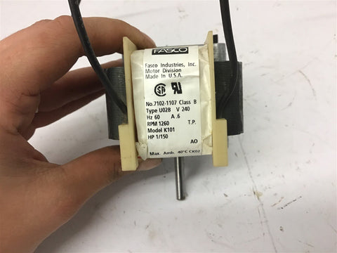 Fasco 7102-1107 U02B K101 1/150 Hp 1260 Rpm 240 Volts Return Policy Returns accepted within 30 days. Items sold as is cannot be returned, unless description is in error. Buyer pays return freight. Shipping Policy We ship almost all items with 1 business day of cleared payment. We ship USPS and UPS. We can ship on your account. If you will be shipping freight, please be sure to provide all delivery contact information including a phone number. We will need to know if you have a fork lift or dock.