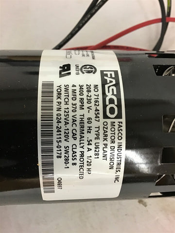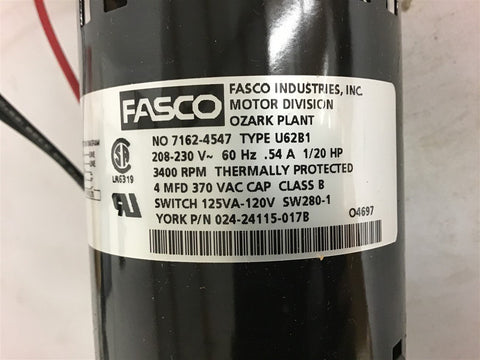 Fasco 7162-4547 1/20 HP Blower Motor 208-230 volts 3400 Rpm Return Policy Returns accepted within 30 days. Items sold as is cannot be returned, unless description is in error. Buyer pays return freight. Shipping Policy We ship almost all items with 1 business day of cleared payment. We ship USPS and UPS. We can ship on your account. If you will be shipping freight, please be sure to provide all delivery contact information including a phone number. We will need to know if you have a fork lift or dock.