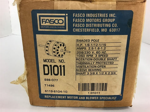 Fasco D1011 Shaded Pole Motor 1/6 1/12 1/15HP 1050 RPM 208/230V Open Ventilation Return Policy Returns accepted within 30 days. Items sold as is cannot be returned, unless description is in error. Buyer pays return freight. Shipping Policy We ship almost all items with 1 business day of cleared payment. We ship USPS and UPS. We can ship on your account. If you will be shipping freight, please be sure to provide all delivery contact information including a phone number. We will need to know if you have a fork lift or dock.