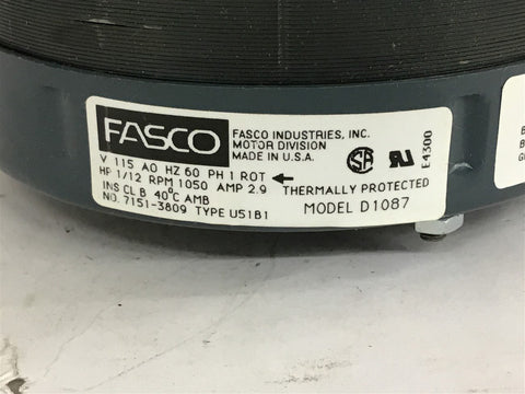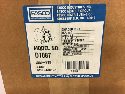 Fasco D1087 1/12 HP Shaded Pole Motor 115 Volts 1050 Rpm 1 Speed Return Policy Returns accepted within 30 days. Items sold as is cannot be returned, unless description is in error. Buyer pays return freight. Shipping Policy We ship almost all items with 1 business day of cleared payment. We ship USPS and UPS. We can ship on your account. If you will be shipping freight, please be sure to provide all delivery contact information including a phone number. We will need to know if you have a fork lift or dock.