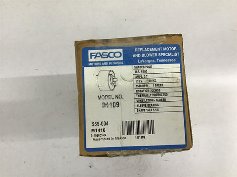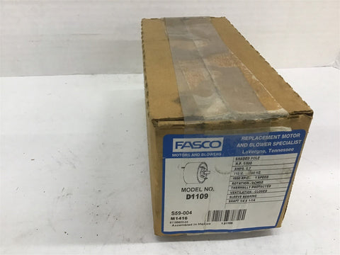 Fasco D1109 1/100 Hp Shaded Pole Motor 115 V 1550 Rpm 1 Speed CCWSE Return Policy Returns accepted within 30 days. Items sold as is cannot be returned, unless description is in error. Buyer pays return freight. Shipping Policy We ship almost all items with 1 business day of cleared payment. We ship USPS and UPS. We can ship on your account. If you will be shipping freight, please be sure to provide all delivery contact information including a phone number. We will need to know if you have a fork lift or dock.