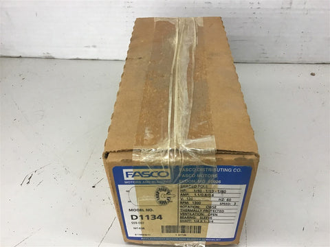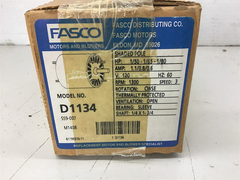 Fasco D1134 1/50-1/65-1/80 HP AC Motor 120 volts 1300 Rpm Return Policy Returns accepted within 30 days. Items sold as is cannot be returned, unless description is in error. Buyer pays return freight. Shipping Policy We ship almost all items with 1 business day of cleared payment. We ship USPS and UPS. We can ship on your account. If you will be shipping freight, please be sure to provide all delivery contact information including a phone number. We will need to know if you have a fork lift or dock.