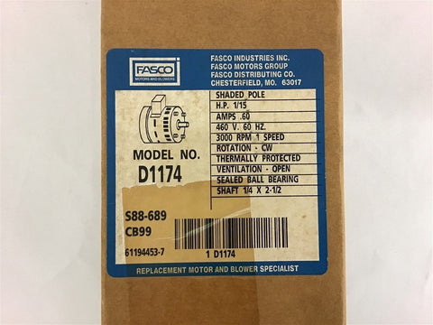 Fasco D1174 1/15 HP AC Motor 460 Volts 3000 Rpm 1 Speed