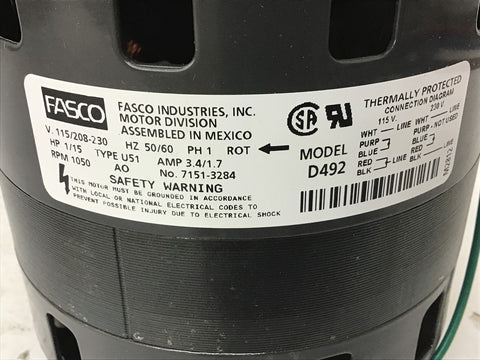 Fasco D492 1/15 HP AC Motor 115/208-230 volts 1050 Rpm Return Policy Returns accepted within 30 days. Items sold as is cannot be returned, unless description is in error. Buyer pays return freight. Shipping Policy We ship almost all items with 1 business day of cleared payment. We ship USPS and UPS. We can ship on your account. If you will be shipping freight, please be sure to provide all delivery contact information including a phone number. We will need to know if you have a fork lift or dock.