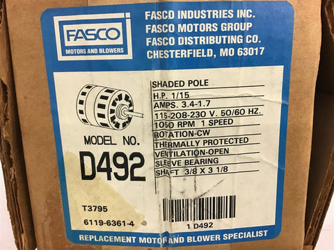Fasco D492 1/15 HP Motor 115-208-230 Volts 1050 Rpm 1 Speed