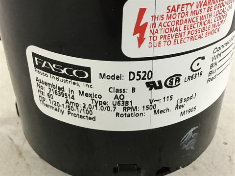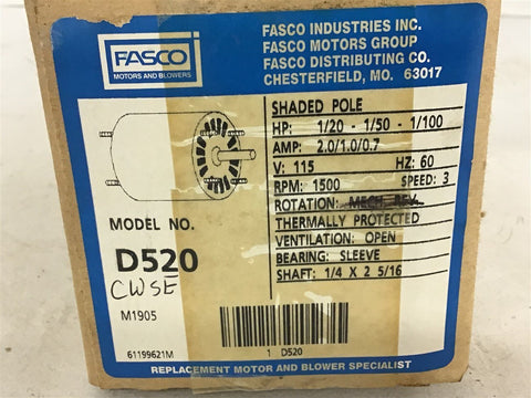 Fasco D520 1/20 1/50 1/100 HP Fan Motor 1550 Rpm 3 Speed 115 Volts Return Policy Returns accepted within 30 days. Items sold as is cannot be returned, unless description is in error. Buyer pays return freight. Shipping Policy We ship almost all items with 1 business day of cleared payment. We ship USPS and UPS. We can ship on your account. If you will be shipping freight, please be sure to provide all delivery contact information including a phone number. We will need to know if you have a fork lift or dock.