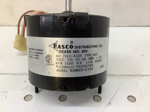 Fasco D534 Motor 1/35HP 115V 1500RPM 60HZ 1.43AMP Return Policy Returns accepted within 30 days. Items sold as is cannot be returned, unless description is in error. Buyer pays return freight. Shipping Policy We ship almost all items with 1 business day of cleared payment. We ship USPS and UPS. We can ship on your account. If you will be shipping freight, please be sure to provide all delivery contact information including a phone number. We will need to know if you have a fork lift or dock.