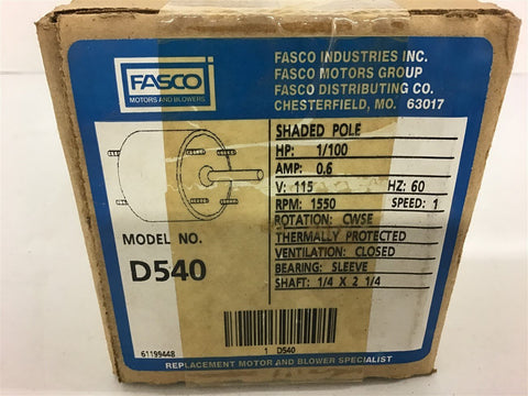 Fasco D540 1/100 HP Fan Motor 1550 Rpm 115 Volts 1 Speed Return Policy Returns accepted within 30 days. Items sold as is cannot be returned, unless description is in error. Buyer pays return freight. Shipping Policy We ship almost all items with 1 business day of cleared payment. We ship USPS and UPS. We can ship on your account. If you will be shipping freight, please be sure to provide all delivery contact information including a phone number. We will need to know if you have a fork lift or dock.
