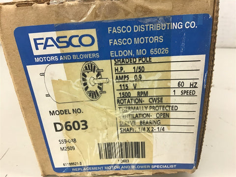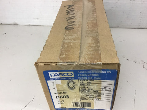 Fasco D603 1/50 Hp Blower Motor 115 volts 1500 rpm 1 speed Return Policy Returns accepted within 30 days. Items sold as is cannot be returned, unless description is in error. Buyer pays return freight. Shipping Policy We ship almost all items with 1 business day of cleared payment. We ship USPS and UPS. We can ship on your account. If you will be shipping freight, please be sure to provide all delivery contact information including a phone number. We will need to know if you have a fork lift or dock.