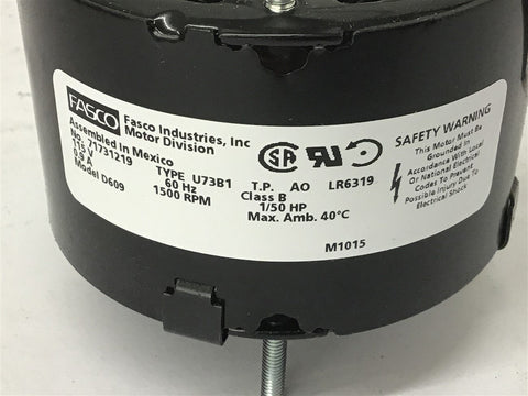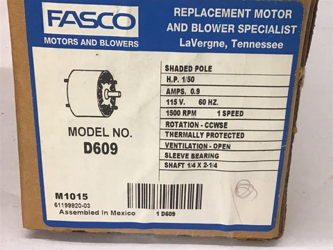 Fasco D609 1/50 HP AC Motor 115 volts 1500 Rpm 0.9 Amps 1 Speed Return Policy Returns accepted within 30 days. Items sold as is cannot be returned, unless description is in error. Buyer pays return freight. Shipping Policy We ship almost all items with 1 business day of cleared payment. We ship USPS and UPS. We can ship on your account. If you will be shipping freight, please be sure to provide all delivery contact information including a phone number. We will need to know if you have a fork lift or dock.