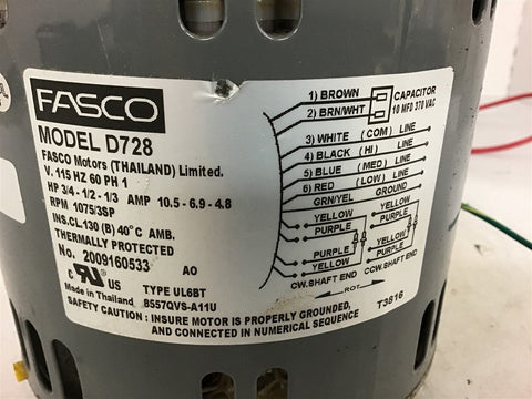 Fasco D728 3/4-1/2-1/3 Hp 115 volts 1075 Rpm 3 Speed Single Phase Return Policy Returns accepted within 30 days. Items sold as is cannot be returned, unless description is in error. Buyer pays return freight. Shipping Policy We ship almost all items with 1 business day of cleared payment. We ship USPS and UPS. We can ship on your account. If you will be shipping freight, please be sure to provide all delivery contact information including a phone number. We will need to know if you have a fork lift or dock.