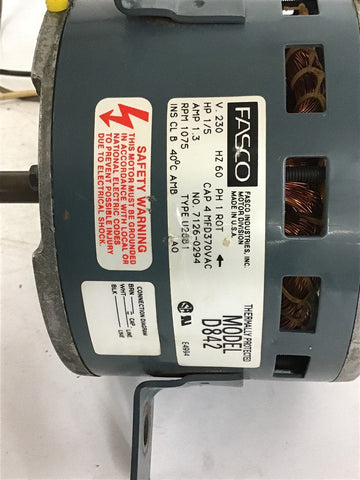 Fasco D842 1/5 Hp AC Motor 230 Volts 1075 rpm 1.3 Amps Return Policy Returns accepted within 30 days. Items sold as is cannot be returned, unless description is in error. Buyer pays return freight. Shipping Policy We ship almost all items with 1 business day of cleared payment. We ship USPS and UPS. We can ship on your account. If you will be shipping freight, please be sure to provide all delivery contact information including a phone number. We will need to know if you have a fork lift or dock.