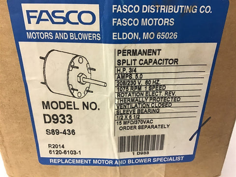 Fasco D933 3/4 HP Blower Motor 208/230 volts 1075 Rpm 1 Speed Return Policy Returns accepted within 30 days. Items sold as is cannot be returned, unless description is in error. Buyer pays return freight. Shipping Policy We ship almost all items with 1 business day of cleared payment. We ship USPS and UPS. We can ship on your account. If you will be shipping freight, please be sure to provide all delivery contact information including a phone number. We will need to know if you have a fork lift or dock.