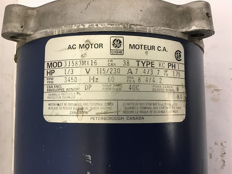 GE 3J583MX16 1/3 HP AC Motor 115/230 Volts Single Phase 3450 Rpm Return Policy Returns accepted within 30 days. Items sold as is cannot be returned, unless description is in error. Buyer pays return freight. Shipping Policy We ship almost all items with 1 business day of cleared payment. We ship USPS and UPS. We can ship on your account. If you will be shipping freight, please be sure to provide all delivery contact information including a phone number. We will need to know if you have a fork lift or dock.