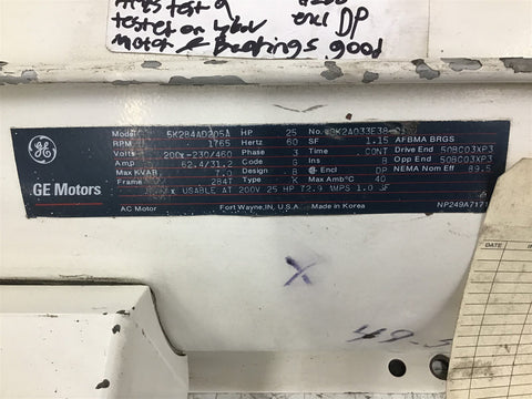 GE 5K284AD205A 25HP 1765/1800RPM 4Pole 200-230/460V 284T TENV 3PH AC Motor Return Policy Returns accepted within 30 days. Items sold as is cannot be returned, unless description is in error. Buyer pays return freight. Shipping Policy We ship almost all items with 1 business day of cleared payment. We ship USPS and UPS. We can ship on your account. If you will be shipping freight, please be sure to provide all delivery contact information including a phone number. We will need to know if you have a fork lift or dock.