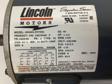 Lincoln SRN4S1.5TCTZ61 Motor 1 1/2 HP 230/460V 1725RPM 56CZ-90 3 PH TENV Return Policy Returns accepted within 30 days. Items sold as is cannot be returned, unless description is in error. Buyer pays return freight. Shipping Policy We ship almost all items with 1 business day of cleared payment. We ship USPS and UPS. We can ship on your account. If you will be shipping freight, please be sure to provide all delivery contact information including a phone number. We will need to know if you have a fork lift or dock.