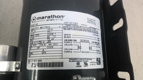 Marathon 48A11T201K 1/3Hp AC 1200Rpm 6P Single Phase 48Z 115V TEAO 60Hz Return Policy Returns accepted within 30 days. Items sold as is cannot be returned, unless description is in error. Buyer pays return freight. Shipping Policy We ship almost all items with 1 business day of cleared payment. We ship USPS and UPS. We can ship on your account. If you will be shipping freight, please be sure to provide all delivery contact information including a phone number. We will need to know if you have a fork lift or dock.