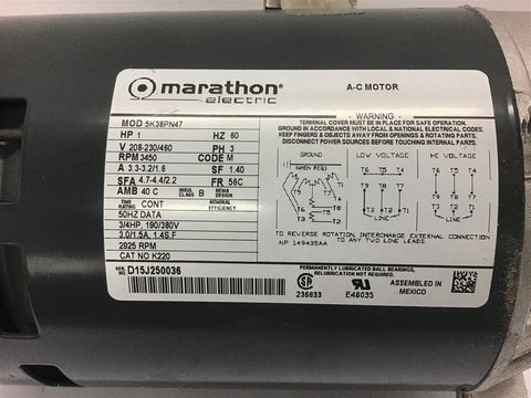Marathon 5K38PN47 1 HP AC Motor 208-230/460 volts 3600 Rpm 2P 56c frame Return Policy Returns accepted within 30 days. Items sold as is cannot be returned, unless description is in error. Buyer pays return freight. Shipping Policy We ship almost all items with 1 business day of cleared payment. We ship USPS and UPS. We can ship on your account. If you will be shipping freight, please be sure to provide all delivery contact information including a phone number. We will need to know if you have a fork lift or dock.