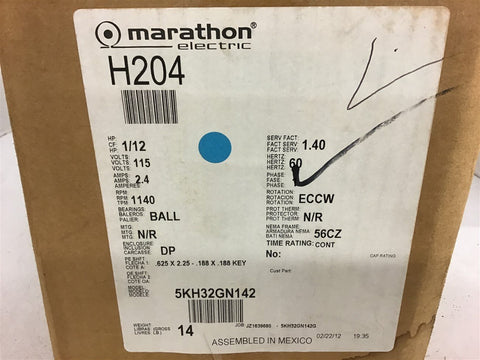 Marathon Electric H204 1/12 HP AC Motor 115 volts 1140 Rpm 2.4 Amps 56CZ Frame Return Policy Returns accepted within 30 days. Items sold as is cannot be returned, unless description is in error. Buyer pays return freight. Shipping Policy We ship almost all items with 1 business day of cleared payment. We ship USPS and UPS. We can ship on your account. If you will be shipping freight, please be sure to provide all delivery contact information including a phone number. We will need to know if you have a fork lift or dock.