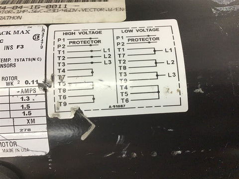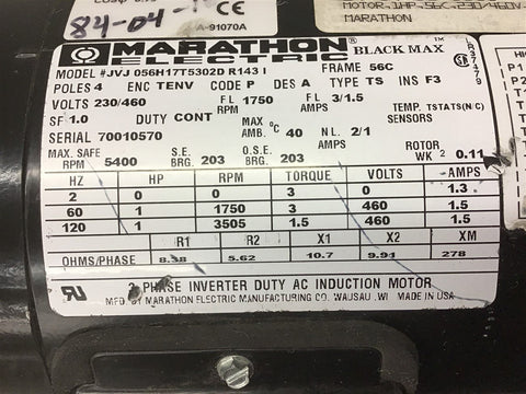 Marathon JVJ056H17T5302D 1 Hp AC Motor 460 volts 1800 Rpm 56C FR w/ Encoder Return Policy Returns accepted within 30 days. Items sold as is cannot be returned, unless description is in error. Buyer pays return freight. Shipping Policy We ship almost all items with 1 business day of cleared payment. We ship USPS and UPS. We can ship on your account. If you will be shipping freight, please be sure to provide all delivery contact information including a phone number. We will need to know if you have a fork lift or dock.