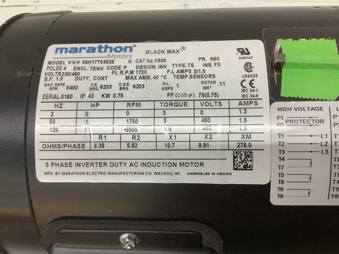 Marathon VVH 56H17T5302E 1HP 230/460V 1725RPM 4P 56C FR 3PH 60/120HZ TENV Return Policy Returns accepted within 30 days. Items sold as is cannot be returned, unless description is in error. Buyer pays return freight. Shipping Policy We ship almost all items with 1 business day of cleared payment. We ship USPS and UPS. We can ship on your account. If you will be shipping freight, please be sure to provide all delivery contact information including a phone number. We will need to know if you have a fork lift or dock.