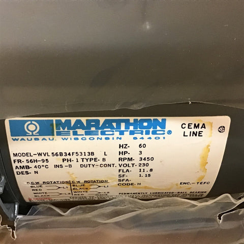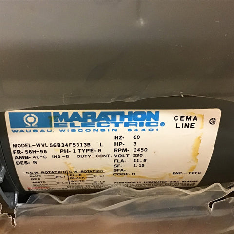 Marathon WVL56B34F5313B 3 Hp Ac Motor 230 Volts 3450 Rpm 2P Return Policy Returns accepted within 30 days. Items sold as is cannot be returned, unless description is in error. Buyer pays return freight. Shipping Policy We ship almost all items with 1 business day of cleared payment. We ship USPS and UPS. We can ship on your account. If you will be shipping freight, please be sure to provide all delivery contact information including a phone number. We will need to know if you have a fork lift or dock.