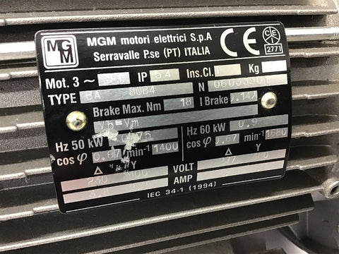 MGM BA 80B4 0.9 KW AC Brake motor 277 480 Volts Return Policy Returns accepted within 30 days. Items sold as is cannot be returned, unless description is in error. Buyer pays return freight. Shipping Policy We ship almost all items with 1 business day of cleared payment. We ship USPS and UPS. We can ship on your account. If you will be shipping freight, please be sure to provide all delivery contact information including a phone number. We will need to know if you have a fork lift or dock.