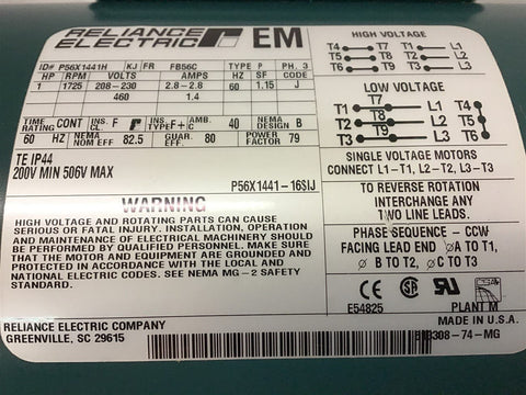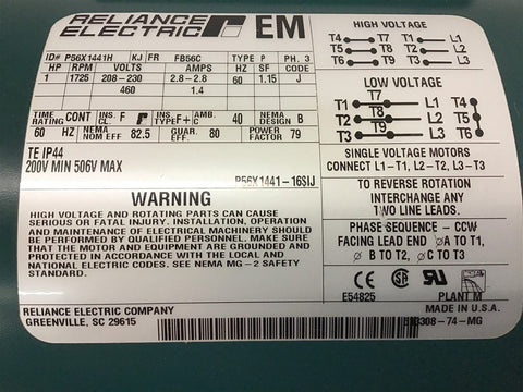 Reliance Electric P56X1441H AC Motor 1 HP 1725 RPM 4 Poles 208-230VAC 3 Phase Return Policy Returns accepted within 30 days. Items sold as is cannot be returned, unless description is in error. Buyer pays return freight. Shipping Policy We ship almost all items with 1 business day of cleared payment. We ship USPS and UPS. We can ship on your account. If you will be shipping freight, please be sure to provide all delivery contact information including a phone number. We will need to know if you have a fork lift or dock.