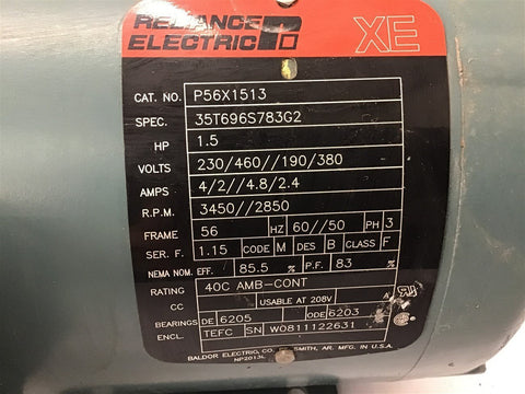 Reliance Electric P56X1513 1.5 HP AC Motor 3450 RPM 2 Poles 230/460VAC 56 Frame Return Policy Returns accepted within 30 days. Items sold as is cannot be returned, unless description is in error. Buyer pays return freight. Shipping Policy We ship almost all items with 1 business day of cleared payment. We ship USPS and UPS. We can ship on your account. If you will be shipping freight, please be sure to provide all delivery contact information including a phone number. We will need to know if you have a fork lift or dock.