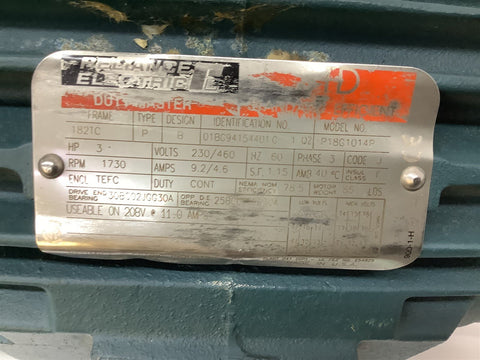 Reliance P18G1014P AC Motor 3 Hp 230/460 V 1800 Rpm 4P 182TC 3 Ph 60 Hz TEFC Return Policy Returns accepted within 30 days. Items sold as is cannot be returned, unless description is in error. Buyer pays return freight. Shipping Policy We ship almost all items with 1 business day of cleared payment. We ship USPS and UPS. We can ship on your account. If you will be shipping freight, please be sure to provide all delivery contact information including a phone number. We will need to know if you have a fork lift or dock.
