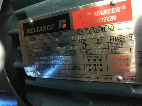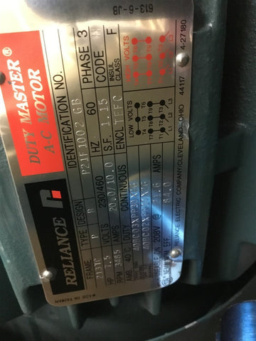 Reliance P21F1002GB 7.5 HP AC Motor 230/460 volts 3600 Rpm 2P 213TC Return Policy Returns accepted within 30 days. Items sold as is cannot be returned, unless description is in error. Buyer pays return freight. Shipping Policy We ship almost all items with 1 business day of cleared payment. We ship USPS and UPS. We can ship on your account. If you will be shipping freight, please be sure to provide all delivery contact information including a phone number. We will need to know if you have a fork lift or dock.