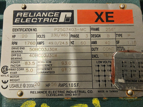 Reliance P25G7403-MC 20HP 1800RPM 4P 3PH 230/460V 256T AC Motor