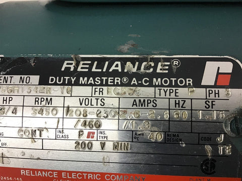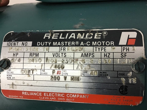 Reliance P56H1342R-YQ 3/4 HP AC Motor 208-230/460 Volts 3450 Rpm 2P