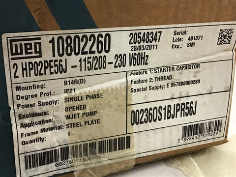 Weg 00236OS1BJPR56J 2 HP AC Motor 115/208-230 volt 3600 Rpm 2P
