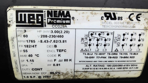 WEG 00318ET3E182T 3 HPAC Motor 1800 RPM 4 P 12/4T 208-230/460 TEFC 60 HZ Return Policy Returns accepted within 30 days. Items sold as is cannot be returned, unless description is in error. Buyer pays return freight. Shipping Policy We ship almost all items with 1 business day of cleared payment. We ship USPS and UPS. We can ship on your account. If you will be shipping freight, please be sure to provide all delivery contact information including a phone number. We will need to know if you have a fork lift or dock.