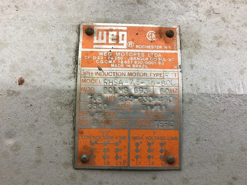 Weg RHSA-7.5-36-80L 7.5 HP AC Motor 208-230/460 Volts 3500 Rpm 2P 80L Frame Return Policy Returns accepted within 30 days. Items sold as is cannot be returned, unless description is in error. Buyer pays return freight. Shipping Policy We ship almost all items with 1 business day of cleared payment. We ship USPS and UPS. We can ship on your account. If you will be shipping freight, please be sure to provide all delivery contact information including a phone number. We will need to know if you have a fork lift or dock.