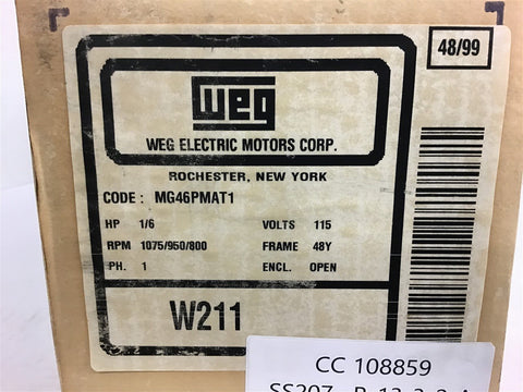 Weg W211 1/6 HP AC Motor 115 volts 1075/950/800 Rpm 48Y Single Phase Return Policy Returns accepted within 30 days. Items sold as is cannot be returned, unless description is in error. Buyer pays return freight. Shipping Policy We ship almost all items with 1 business day of cleared payment. We ship USPS and UPS. We can ship on your account. If you will be shipping freight, please be sure to provide all delivery contact information including a phone number. We will need to know if you have a fork lift or dock.