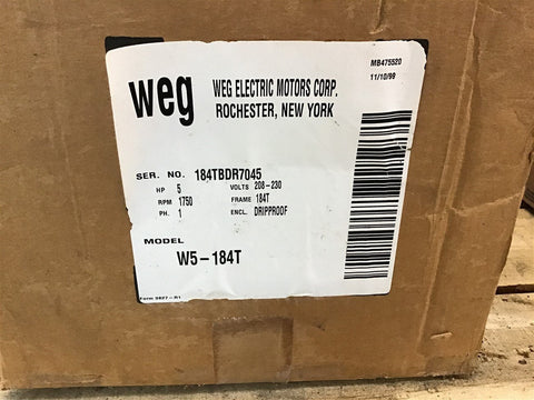 Weg W5-184TBDR045 Motor 5 HP 1750 RPM 208-230 184T DRIPPROOF Return Policy Returns accepted within 30 days. Items sold as is cannot be returned, unless description is in error. Buyer pays return freight. Shipping Policy We ship almost all items with 1 business day of cleared payment. We ship USPS and UPS. We can ship on your account. If you will be shipping freight, please be sure to provide all delivery contact information including a phone number. We will need to know if you have a fork lift or dock.