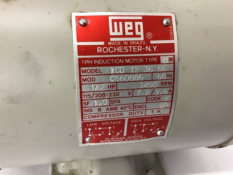 Weg XCD 123656 1/2 HP AC Motor 115/208-230 volt 3600 rpm 2P Return Policy Returns accepted within 30 days. Items sold as is cannot be returned, unless description is in error. Buyer pays return freight. Shipping Policy We ship almost all items with 1 business day of cleared payment. We ship USPS and UPS. We can ship on your account. If you will be shipping freight, please be sure to provide all delivery contact information including a phone number. We will need to know if you have a fork lift or dock.